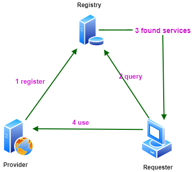 2 和 3. Requester 节点到 Regitry 节点查信息 , 找到需要的Provider及其提供的Service;