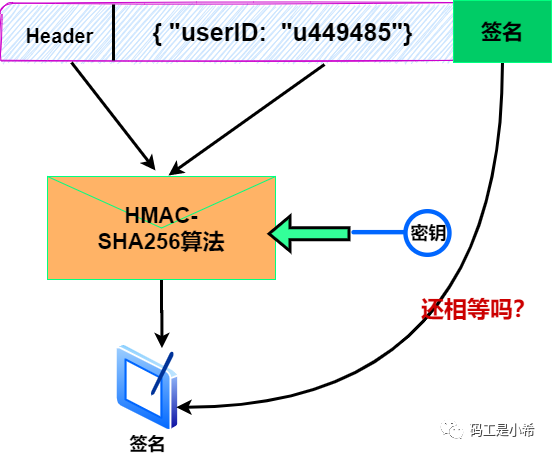 这个 token 我不保存, 当小F把这个 token 给我发过来的时候,我再用同样的 HMAC-SHA256 算法和同样的密钥,对数据再计算一次签名, 和token 中的签名做个比较, 如果相同, 我就知道小F已经登录过了,并且可以直接取到小F的 user id, 如果不相同, 数据部分肯定被人篡改过, 我就告诉发送者:对不起,你没有认证;