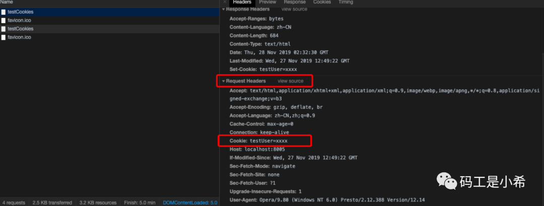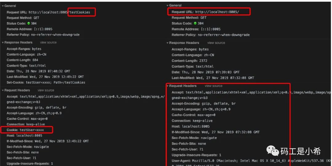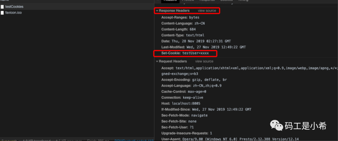 项目启动以后我们输入路径http://localhost:8005/testCookies,然后查看发的请求。可以看到下面那张图使我们首次访问服务器时发送的请求,可以看到服务器返回的响应中有 Set-Cookie 字段。而里面的 key=value 正是我们服务器中设置的值。