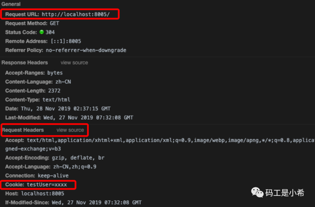 接下来我们换一个请求呢?那是不是 Cookie 也会带过去呢?接下来我们输入路径http://localhost:8005请求。我们可以看到 Cookie 字段还是被带过去了。