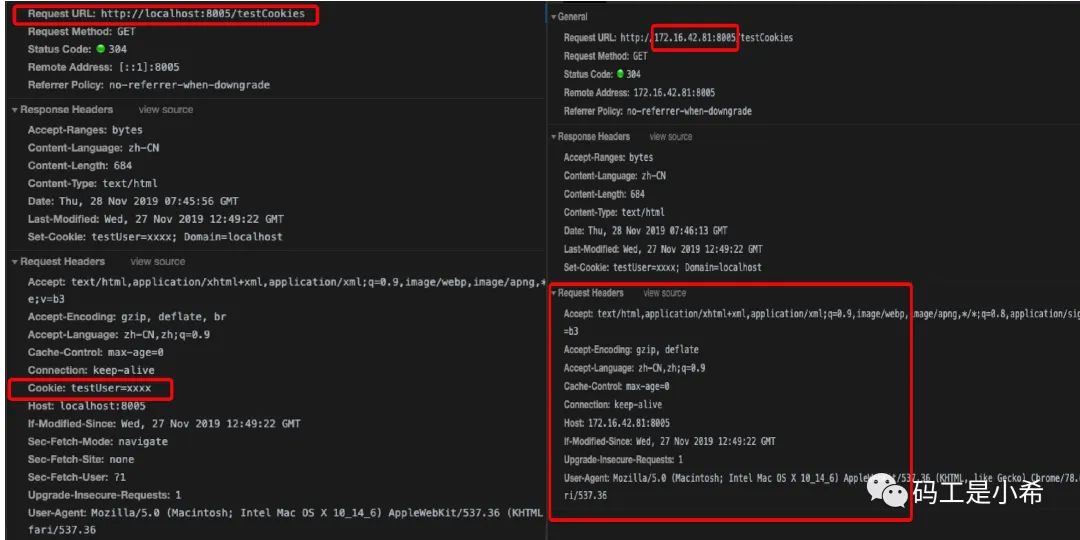 Domain设置为cookie.setDomain("localhost"),接下来我们访问http://localhost:8005/testCookies我们发现下图中左边的是有Cookie的字段的,但是我们访问http://172.16.42.81:8005/testCookies,看下图的右边可以看到没有 Cookie 的字段了。这就是 Domain 控制的域名发送Cookie。