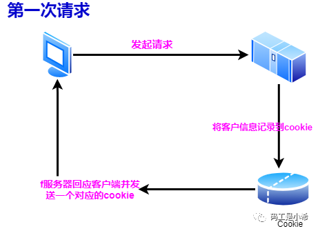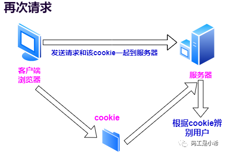 客户端请求服务器时,如果该服务器需要记录该用户状态,就使用 response 向客户端浏览器发送一个cookie,客户端会将 cookie 保存起来。当浏览器再次请求该网站时,浏览器把请求和该 cookie 一起提交给服务器。服务器检查该cookie,以此来辨认用户状态。