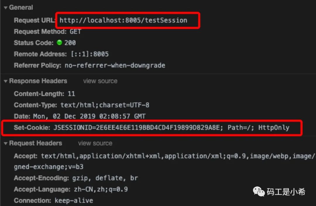 这里我们写一个新的方法来测试Session是如何产生的,我们在请求参数中加上 HttpSession session,然后再浏览器中输入http://localhost:8005/testSession进行访问可以看到在服务器的返回头中在Cookie中生成了一个 SessionId。然后浏览器记住 SessionId 下次访问时可以带着此Id,然后就能根据此Id找到存储在服务端的信息了。