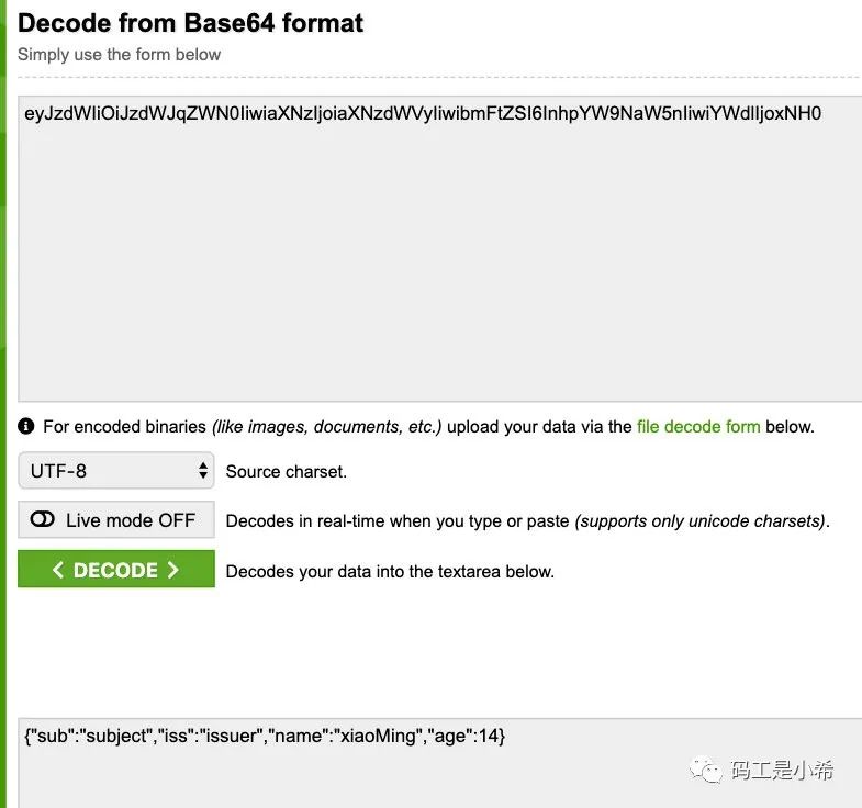 默认情况下 JWT 是不加密的,任何人只要在网上进行Base64解码就可以读到信息,所以一般不要将秘密信息放在这个部分。这个Json对象也要用 Base64URL 算法转成字符串;