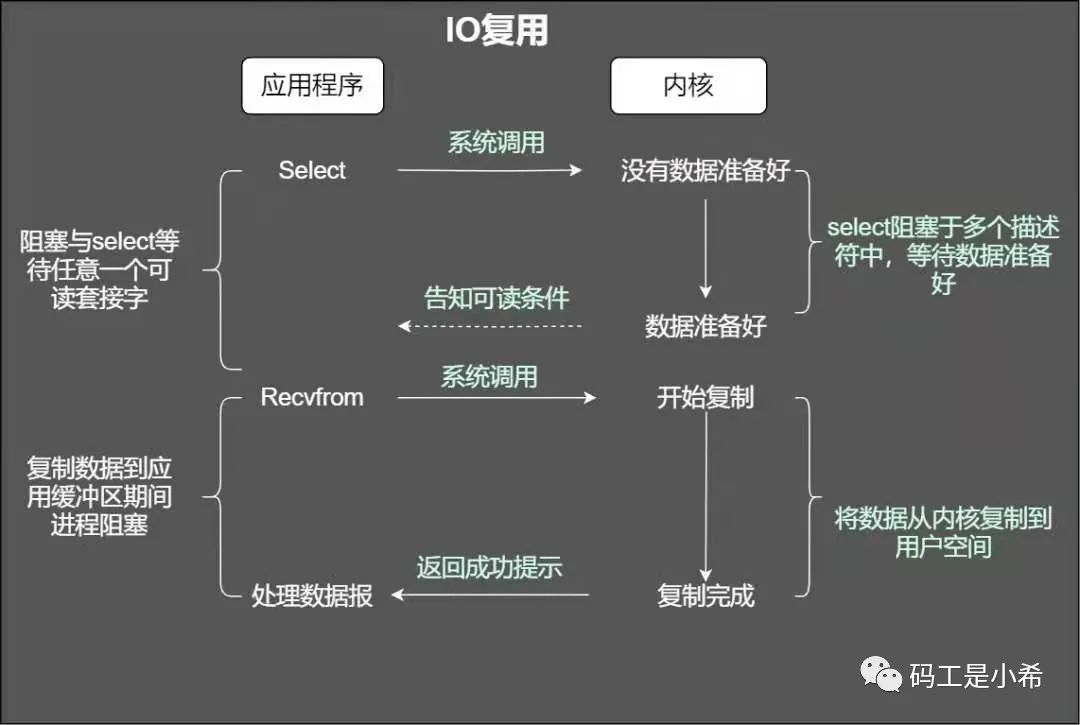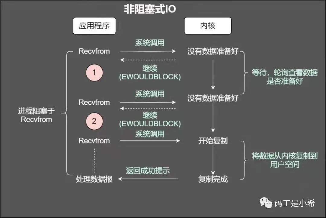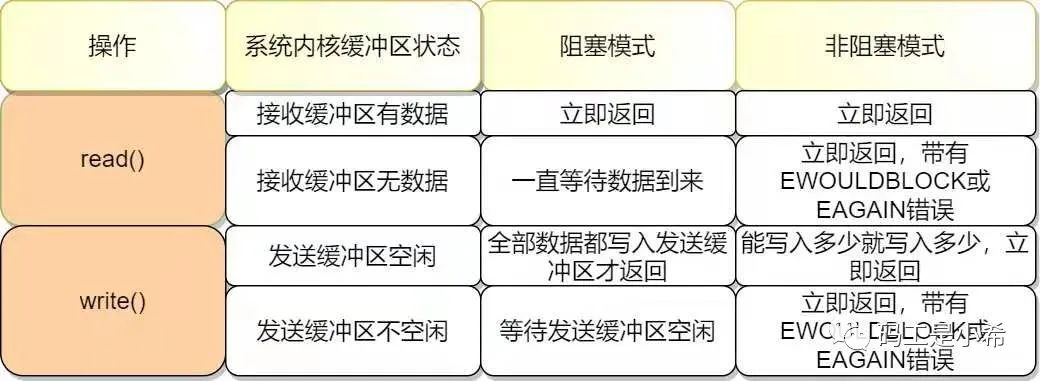 咱们知道套接字有个「缓冲区」,如果缓冲区没有数据可读,那么在非阻塞的情况下调用read就会立即返回,返回自然会有个状态,不然我们一脸懵逼,无法进行下一步。返回可能是「EWOULDBLOCK或者EAGAIN」出错信息。