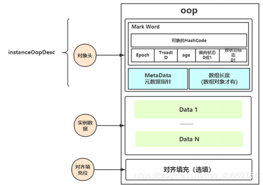 1.对象头(Header): 由Mark Word 和 元数据指针,数组长度 组成。