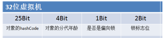 这部分数据的长度在32位和 64位的虚拟机(暂 不考虑开启压缩指针的场景)中分别为32个和64个Bits,官方称它为“Mark Word”。对象需要存储的运行时数据很多,其实已经超出了 32、64位Bitmap结构所能记录的限度,但是对象头信息是与对象自身定义的数据无关的额 外存储成本,考虑到虚拟机的空间效率,Mark Word被设计成一个非固 定的数据结构以便在极小的空间内存储尽量多的信息,它会根据对象的状态复用 自己的存储空间。例如在32位的HotSpot虚拟机 中对象未被锁定的状态下,Mark Word的32个Bits空间中的25Bits用于存储对象哈希码(HashCode),4Bits用于 存储对象分代年龄,2Bits用于存储锁标志 位,1Bit固定为0,在其他状态(轻 量级锁定、重量级锁定、GC标记、可偏向)下对象的存储内容如下表所示)