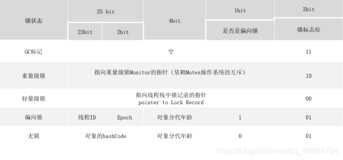 Mark Word: 由hash码,对象所属的年代(GC的时候会用到),对象锁,锁状态标志,偏向锁ID,偏向时间,数组长度等