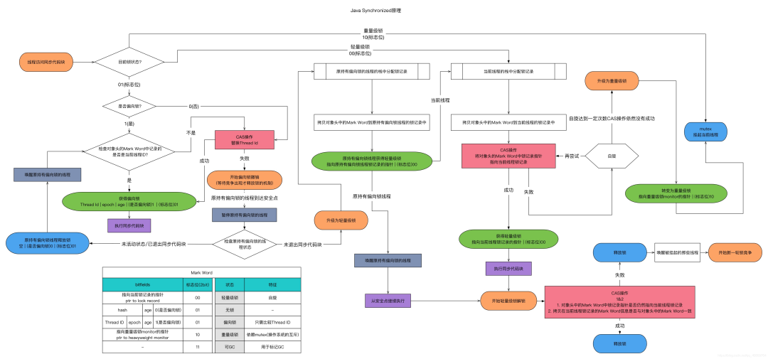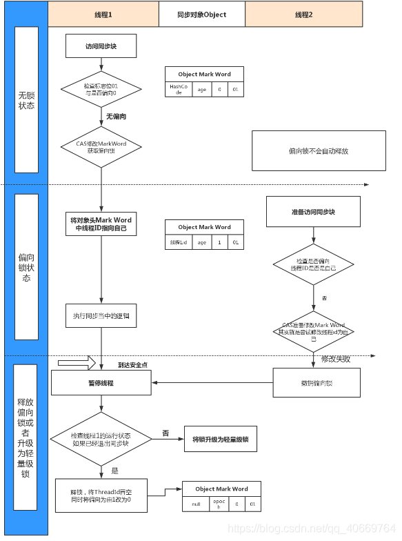当只有线程1访问同步块的时候,会去检查对象Object的对象头中的标志位01和 是否偏向01,(当线程1访问之前,Object是出于无锁的状态,所以Object是无偏向的) 那么线程1通过CAS修改Mark Work获取偏向锁,此时由无锁升级为偏向锁。此时Objected的Mark Word 中的线程ID已经指向线程1了