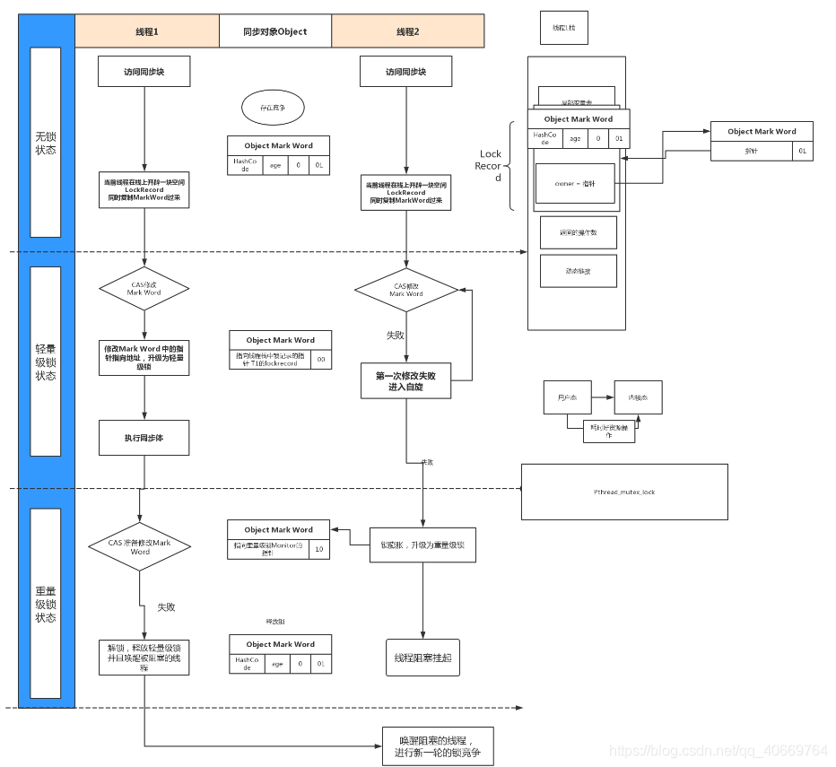锁升级的大致流程:无锁->偏向锁->轻量级锁->重量级锁(锁升级的过程不可逆)