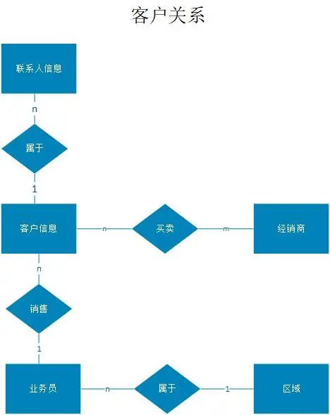 以上,就是我们了解到的需求,接下我们就来分析一下。从需求中我们知道了,我们需要建立最基本的客户基础数据,一个客户的话多个联系信息,客户与经销商有对应的关系,客户与业务员有对应的关系,业务员与对应区域的关系,合同信息,销售信息。