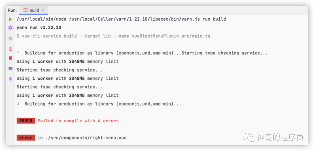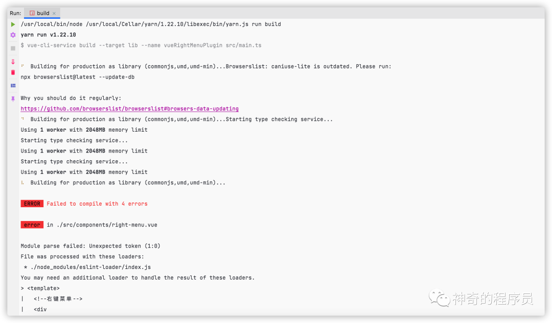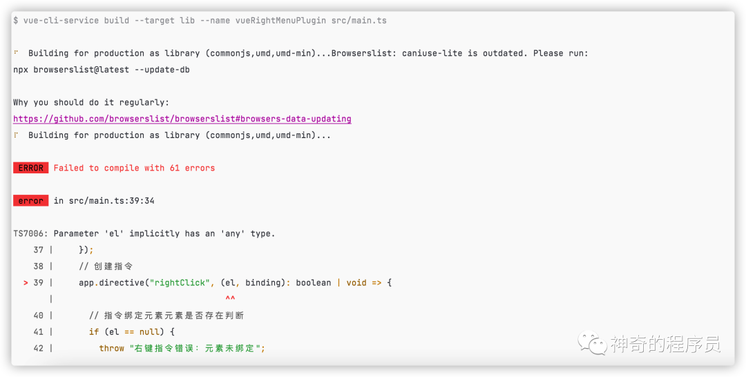 因为我电脑重装过几次系统,一些放在github上的项目我就没有备份,我把项目(https://github.com/likaia/vue-right-click-menu-next/)重新clone到本地,安装依赖项后运行了build命令,意想不到的事情发生了:它报错了😿