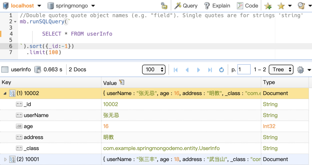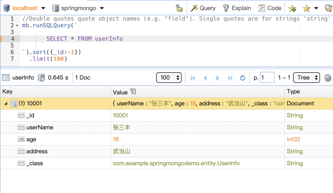 import lombok.Data;import org.springframework.data.annotation.Id;import org.springframework.data.mongodb.core.mapping.Document;/*** @author 公-众-号:程序员阿牛* @Id是Spring的注解,注意不要和Mybatis的搞混* @Document是MongoDB的注解*/@Data@Documentpublic class UserInfo {@Idprivate String userId;private String userName;private Integer age;private String address;}