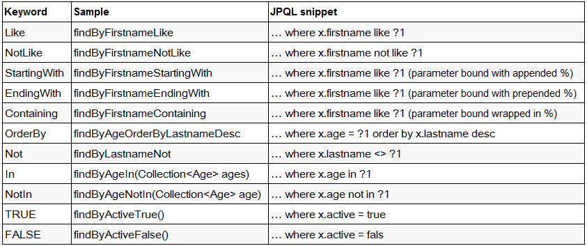 通过继承接口,spring data会自动实现基本的crud方法,同时,还支持通过方法的形式扩展自己想要的方法,例如通过以下关键词扩展(图片在网上找的):