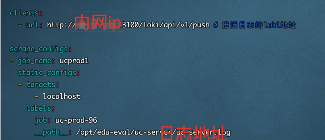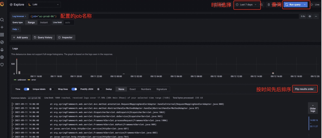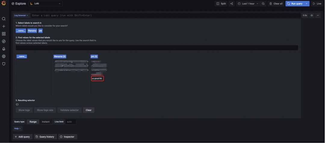 这个 job 就是刚刚 promtail.yml 配置文件中定义的 job,直接输入:{job="uc-prod-96"} 按时间查询即可