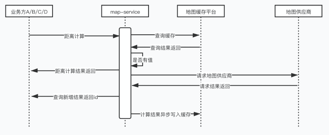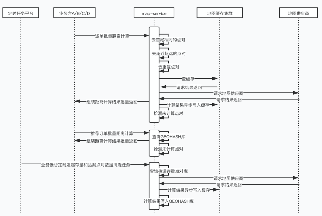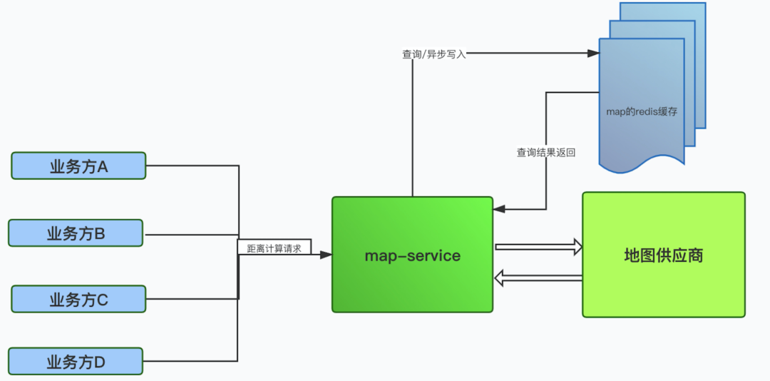 各个业务方根据自己对距离计算的需求去请求地图服务,而推荐订单和派单时由于需要进行海量距离计算,故大部分请求根本就没到地图服务,一般都是自己内部采取某种方式计算了距离的估算值,具体的系统调用图如下所示: