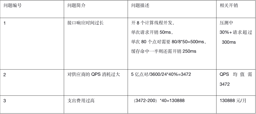 上图非常清楚的看出,分析拆解之后发现,流量打到供应商的点对只有34%左右,如果在按照日均5亿点对的流量计算,最终打到供应商的流量是1.7亿左右,那么平均QPS能降低到1968,而单次接口的响应时间能平均降低到200ms以下,看上去拆解之后方案可行,而此方案要解决如下几个问题: