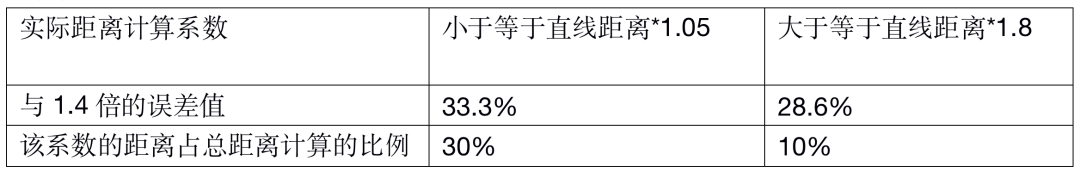 从图表中的数据分析可以很明显的看出,如果我们在业务中使用直线的1.4倍来作为推荐订单的距离计算估值,则总有40%以上的直线距离计算值跟实际值之间有25%以上的误差,这个是业务上无法接受的。