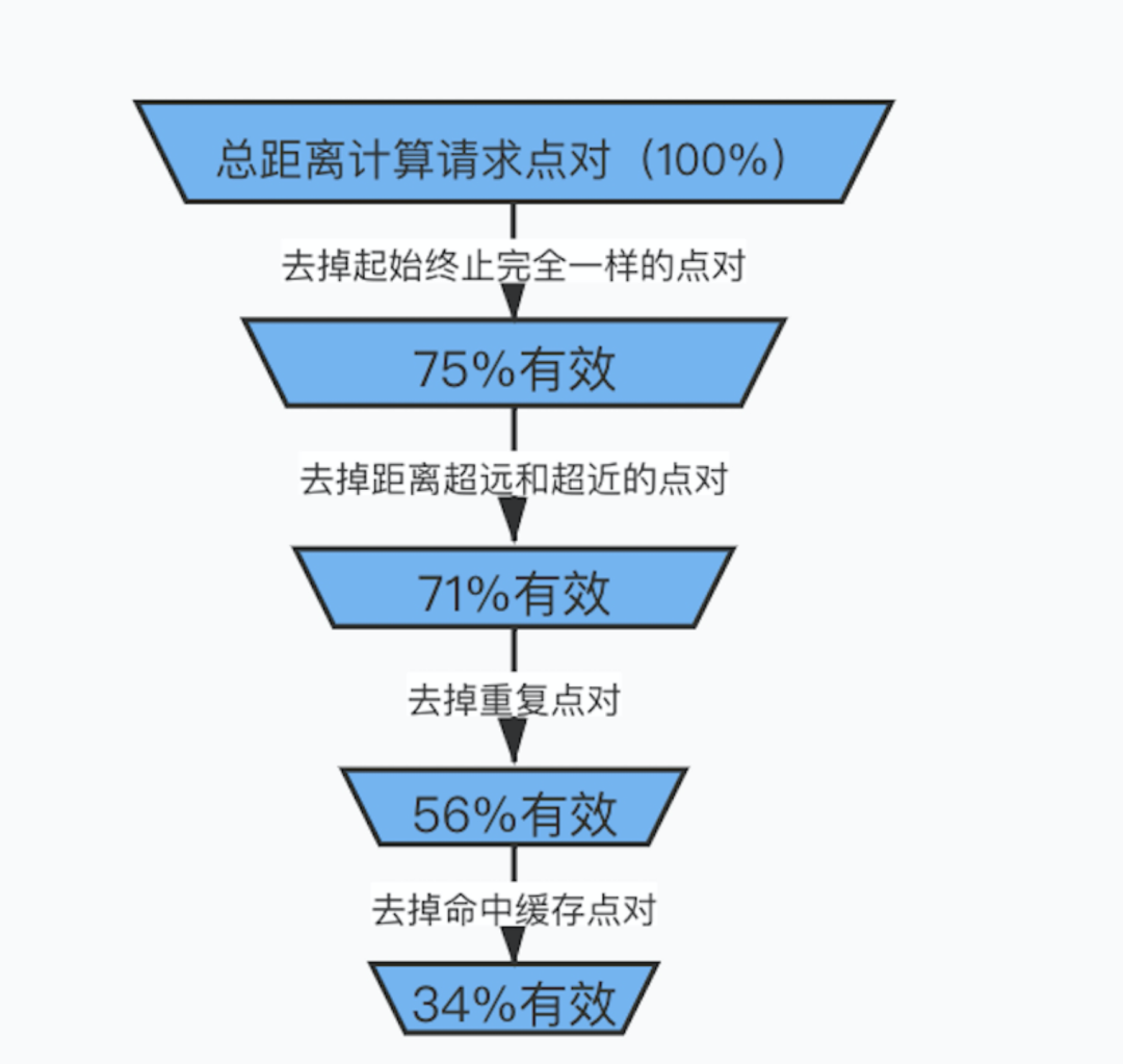 1,起始和终止点是一样的点对,占总点对的25%左右,这部分点对的距离计算直接请求到地图供应商的话,也是要计算QPS的,当然也会消耗请求时间。