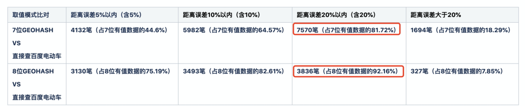 很显然分析结果显示以上的误差率是完全达到业务方需求的,所以设计了先取8位GEOHASH点对的距离计算值,取不到的话再取7位GEOHASH点对的距离计算值的方案,这样的话距离误差在20%内的比例能中和到89%左右,如果有值率能达到92%以上,则对业务来说是完全能接受的。