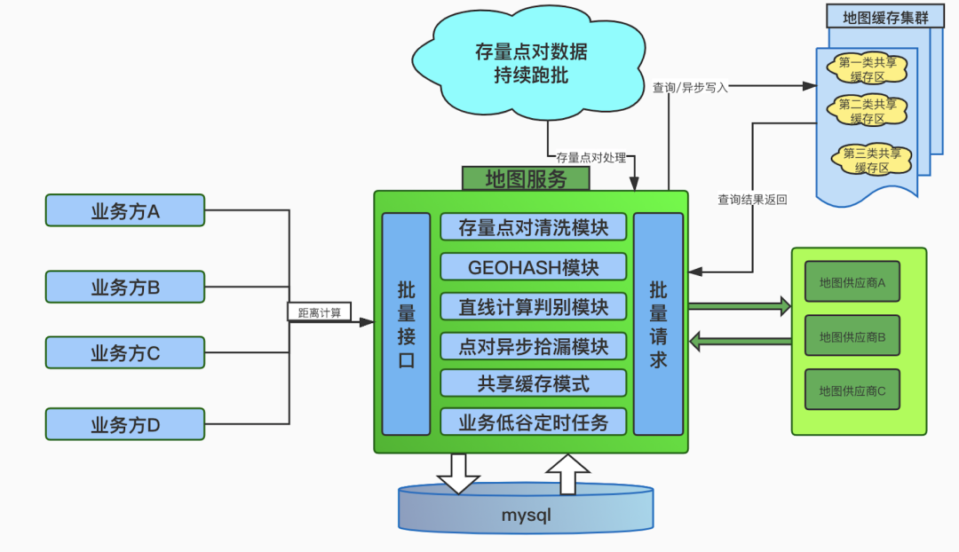共享缓存模式:即无论对于任何业务方的请求,所有的缓存只按照供应商-距离计算模式(步行/骑行/电动自行车)-点对的方式进行存储,每一类缓存大家一起共用,避免各自为战的情况。