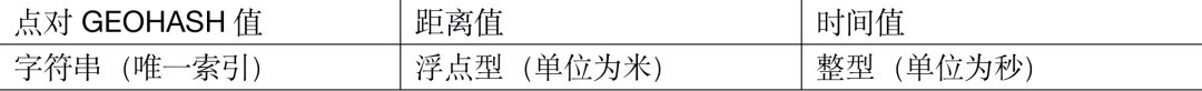 GEOHASH模块:主要是提供七位,八位,八位七位混合的各种GEOHASH点对的查询逻辑,以及将收集来的各类点对通过供应商计算出距离之后以GEOHASH值的方式持久化到mysql,设计了极简的库表结构,即三个字段,如下所示: