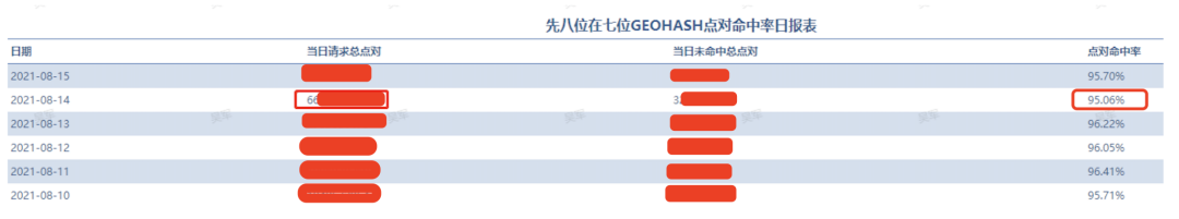 2,推荐订单业务对GEOHASH点对距离值的调用达到了8亿左右,其中7位GEOHASH查询接口有值率达到了79%左右,8位GEOHASH的有值率达到了32%左右,先查询8位,在查询7位的有值率达到82%。接口平均响应时间控制在了25ms左右。