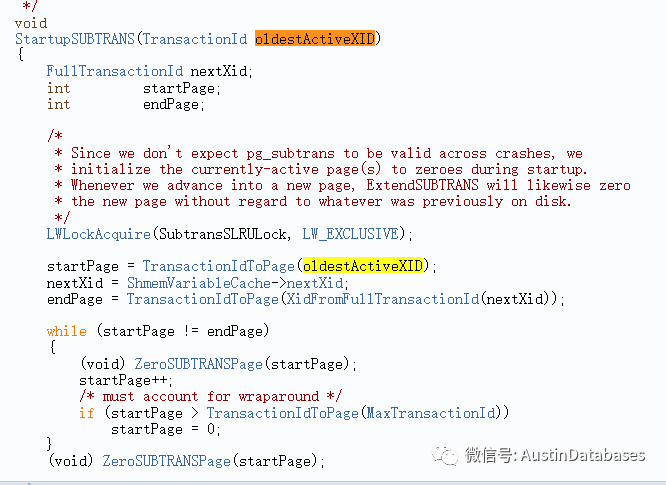 在 subtrans.c中包含关于在PG 重启后处理pg_subtrans中的数据的方法是直接清理掉这些数据,一下这段代码进行相关工作的代码.
