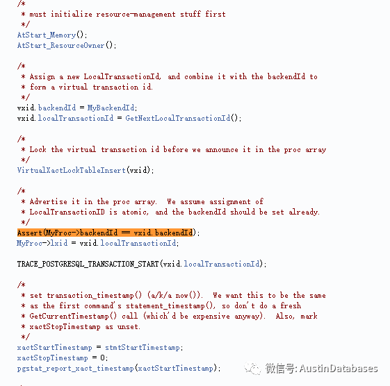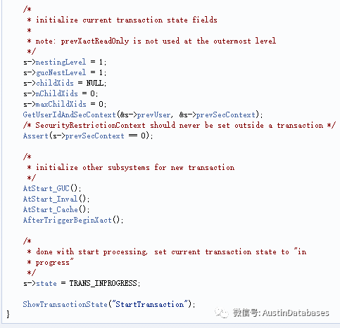 是否是子事务,如果有父事务,则父事务不能为空ResourceOwner currentOwner; bool log_unknown_top = false; 确认当前事务号有效并且事务是在inprogress 的状态 Assert(!TransactionIdIsValid(s->transactionId)); Assert(s->state == TRANS_INPROGRESS);