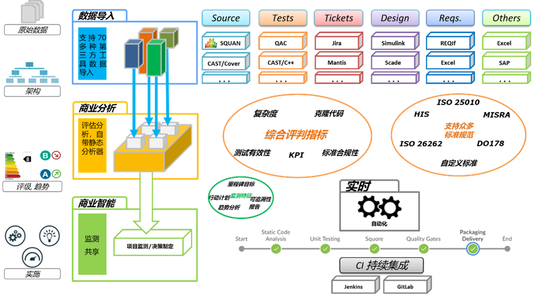 Squore支持动态代码测试工具集VectorCAST、静态代码分析工具Axivion、ECU和网络测试平台CANoe以及项目管理工具JIRA等70多种第三方工具数据的导入。