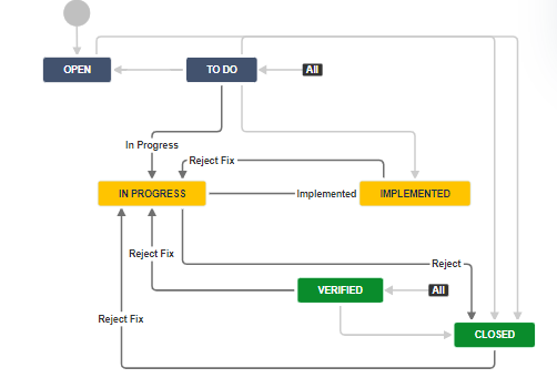 JIRA采用工作流(见图5,截图自JIRA工具界面上对Workflow的定义)对Ticket进行管理,状态则是定义工作流中某个结点的名称表述。在实际项目中,Ticket责任人应根据开发测试阶段的不同来及时更新设定Ticket所属状态。