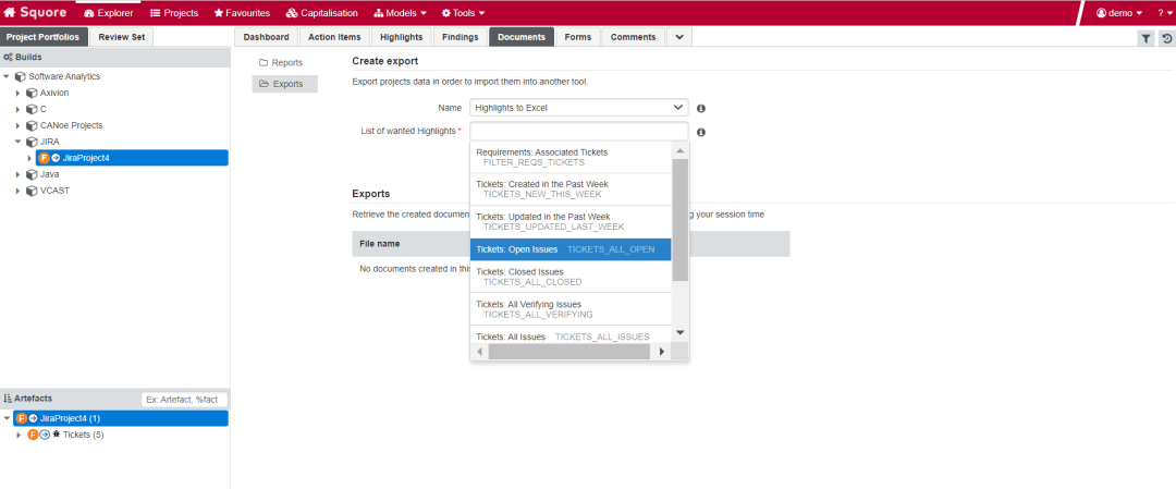 除了工具预置的标准格式报告,Squore也支持用户根据具体需求选取意向的条目数据,制作生成EXCEL/XML/CSV/JSON等多种格式的自定义报告。例如,可以选择导出全部Open状态下的Ticket(见图9),在站会上进行讨论。