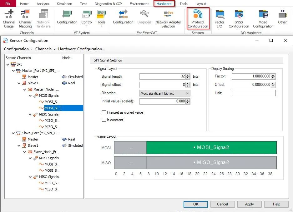 用户自定义信号帧:CANoe内置清晰且便于使用的图形配置界面,用户可自由添加信号定义,实现SPI通讯“数据库”的制作。