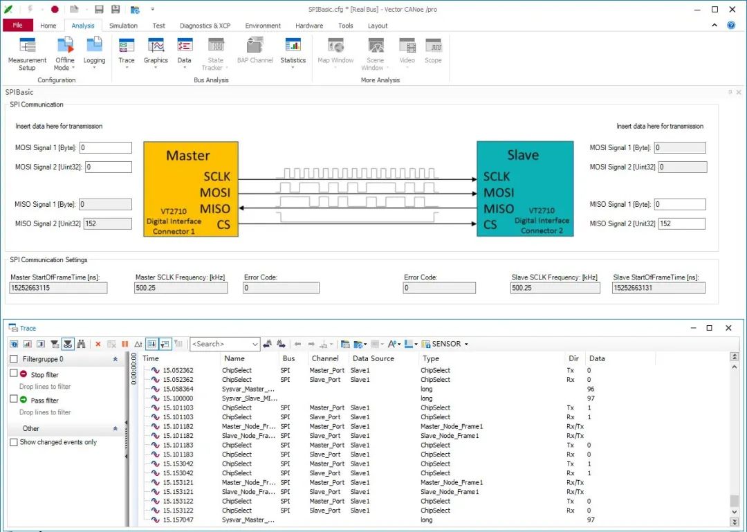 在ECU和传感器系统中,除去各种汽车总线以及智能传感器之间的PSI5和SENT协议之外,在短距离和低成本通信场景中还会广泛使用SPI、UART、RS232、RS485、RS422和I2C等通用串行总线。在HIL系统中,如果被测对象涉及上述串行总线,则需要测试设备能够同时支持对应接口,实现测试、仿真及分析。在CANoe为平台的HIL系统中,I/O板卡VT2710同时支持PSI5/SENT以及上述串行总线协议,为构建经济型测试系统提供便利。