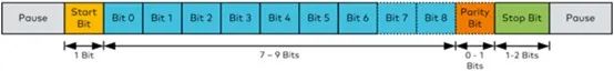 UART帧以一个起始位(逻辑0)开始, 然后是7~9个数据位,由一个可选的奇偶校验位以及一个或两个停止位(逻辑1)完成,该位同时用于接收节点的同步。