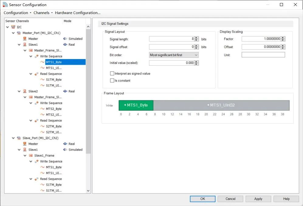 在Sensor Protocol Configuration窗口,可以添加所需I²C总线通道,对于Slave从机可以配置其寻址长度、Slave从机地址、是否对供应商ID等信息进行响应等,对于I²C报文可以配置其读/写长度,以及具体信号的Layout及序列化规则,方便直接通过系统变量进行数据读/写。与其他串行总线一样,除直接通过系统变量进行操作外,也可通过CAPL操作原始帧、FPGA编程开发指令集等方式进行应用。