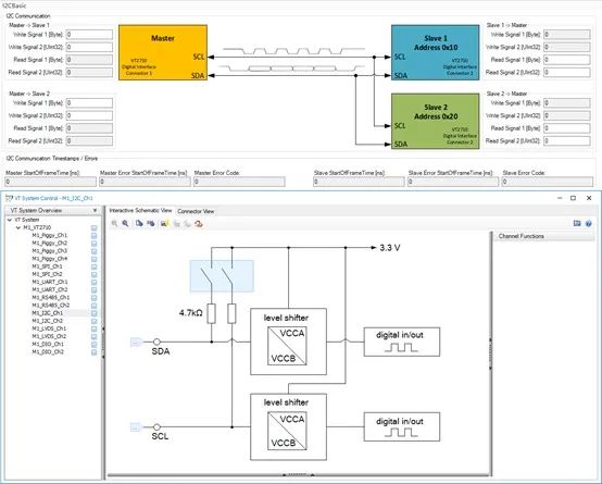 CANoe为I²C的应用提供1主2从的示例工程,利用VT2710的两个通道分别仿真主、从,用户可以基于该示例工程进行修改,创建符合自身使用场景的项目工程。