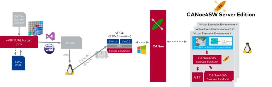CANoe实现了从Windows端到Linux端的无缝衔接,从CANoe 15.0开始可直接对C、C++和Python软件系统进行测试。但对于AUTOSAR软件系统,需要结合vVIRTUALtarget Pro为Classic AUTOSAR软件系统进行虚拟化,并同时为软件系统创建用于被激励或监控的变量接口。结合CANoe和vTESTstudio便可实现“白盒” Component和Integration测试、“黑盒”的SWC和ECU测试、脱离目标板的Debugging、自动化测试和软件接口变量的可视化、更加便捷的虚拟控制器vECU的交互。
