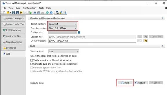 对于基于Classic AUTOSAR的软件系统,可以配合vVIRTUALtarget 5.0生成用于Linux平台下执行的软件系统文件。在vVIRTUALtarget配置界面中加载SWC源码和接口描述文件arxml后,只需在配置完成的vVIRTUALtarget编译界面选择Linux-x64作为平台并选择对应的编译器版本。