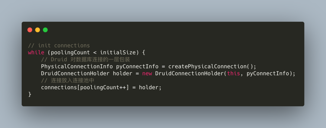 下图是 Druid 在执行 init 方法时数据库连接初始化的流程,当初始化连接小于池内连接时,进行循环创建,直到池内连接满足初始化数量