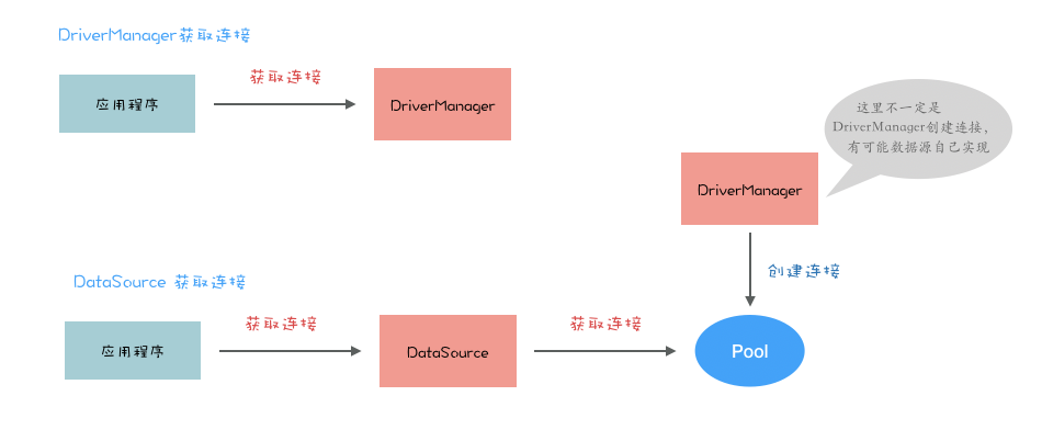 这里画一张图来描述下,针对应用程序使用 DataSource 和 DriverManager 获取连接的不同