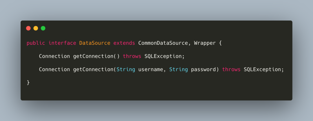 DataSource 中只有两个接口,是一个重载的关系,用于建立 DataSource 所代表数据源的数据库连接