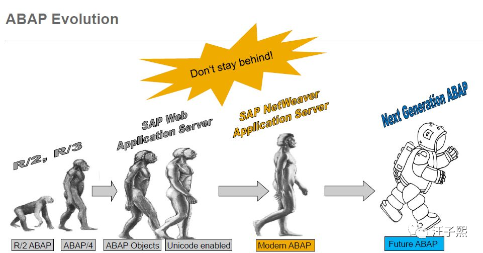 当然 ABAP 也绝不是一门固步自封,躺在过去辉煌功劳簿上停滞不前的编程语言,而是不断吸取其他现代编程语言的长处不断进化。在引入对面向对象编程特性的支持后,ABAP 中出现的 NEW 等关键字,从中也依稀能分辨出 C++/Java 等编程语言的身影。