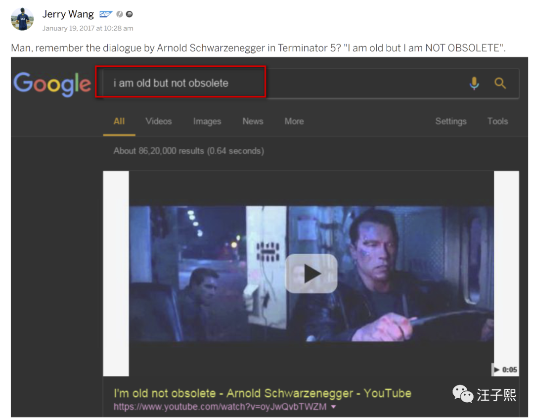 在《终结者5》里他曾经说出一句能够激励无数高龄程序员的金句: