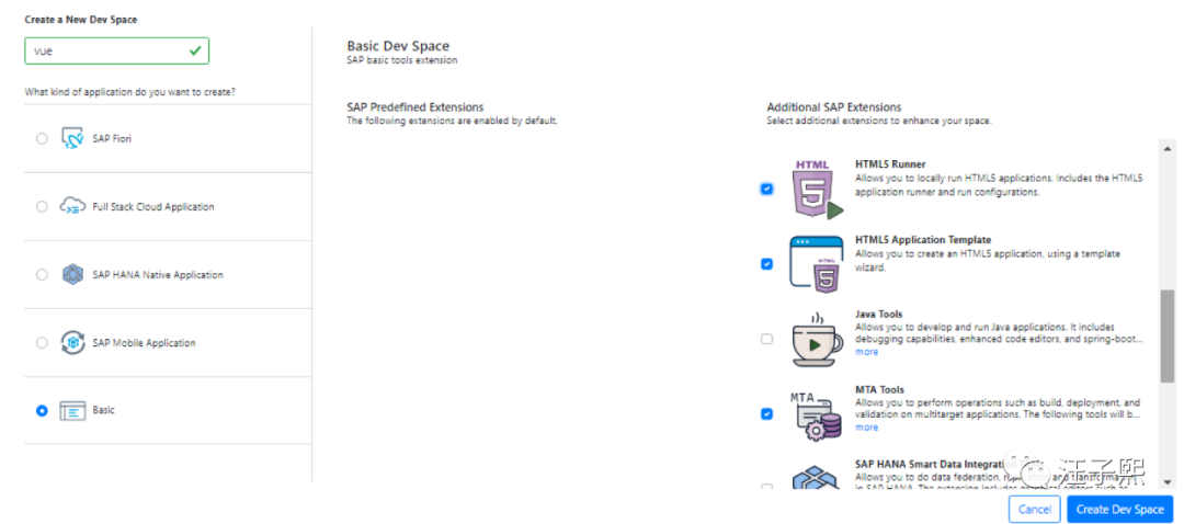 打开 Business Application Studio,创建一个新的 Dev Space,类型为 Basic,选择下列三个 SAP Extensions: