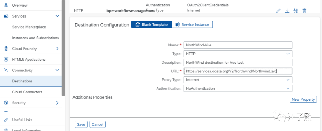 本文会在 SAP Business Application Studio 里开发一个 Vue 应用,消费 NorthWind OData 服务,最后会把该 Vue 服务部署到 SAP Business Technology Platform 平台上,所以需要在 SAP BTP 控制台新建一个 Destination,在该 Destination 内维护指向 NorthWind OData 服务 的 URL.