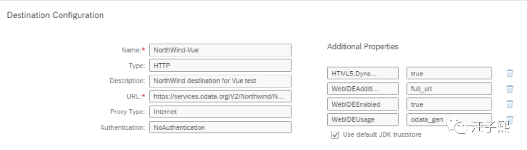 这样,在运行时,部署在 SAP BTP 上的 Vue 应用,能够通过该 Destination 访问 NorthWind OData 服务。