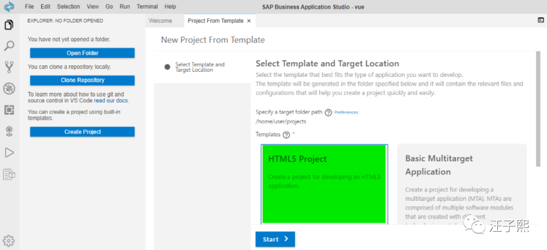使用 SAP Business Application Studio 项目创建向导,新建一个 HTML5 项目: