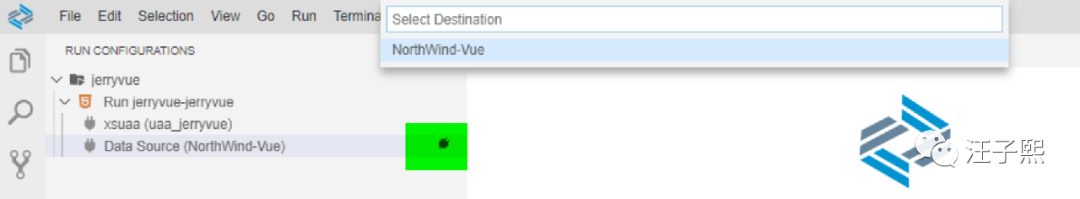 在 Run Configurations 视图里,点击下图高亮的插头图标,将该应用的 Data Source 同之前在 SAP BTP 控制台里创建的 Destination 绑定。这样,运行时 Vue 应用发起对 Data Source 的请求,就会通过绑定的 Destination,路由到 Internet 的 NorthWind OData 服务去。