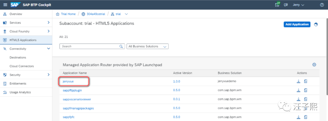成功部署之后,能够在 SAP BTP 控制台的 HTML5 Applications 面板里看到这个 Vue 应用。